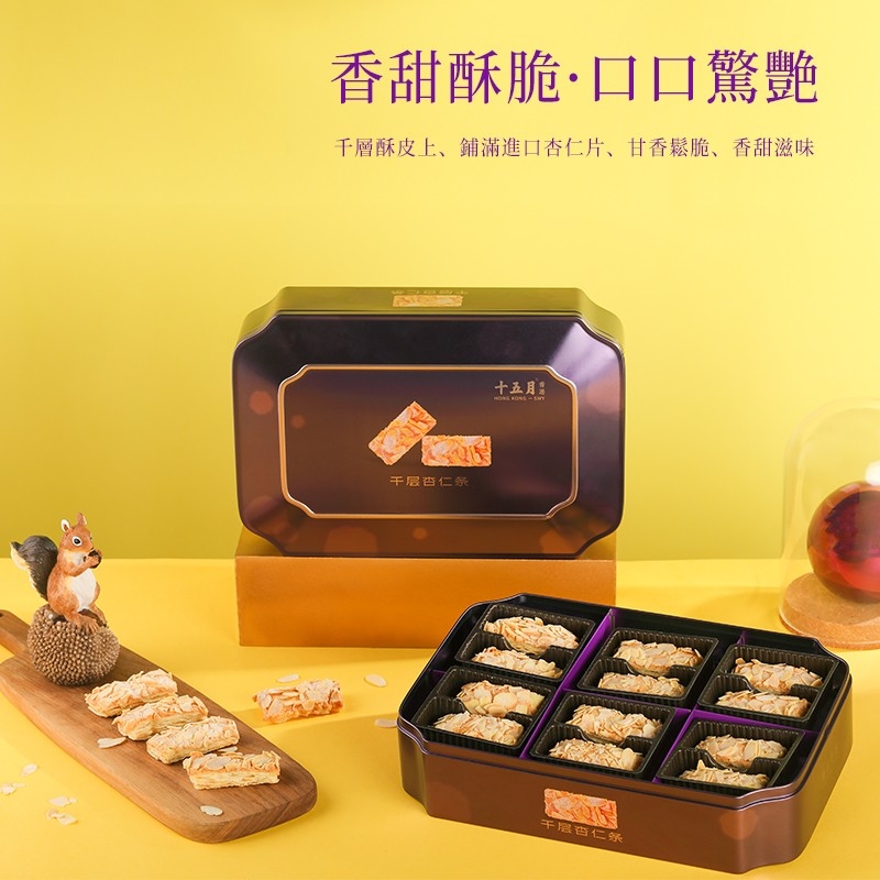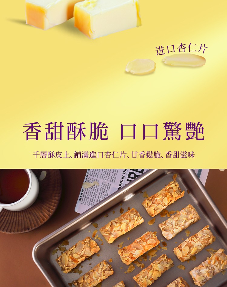 香甜酥脆·口口驚艷千層酥皮上,鋪滿進口杏仁片,甘香鬆脆、香甜滋味。